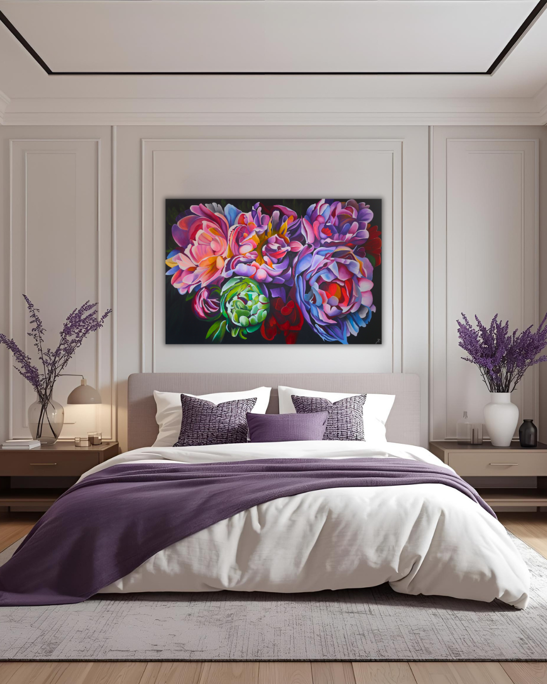 Hluboké tóny růžové, fialové a modré v kombinaci se světelnými přechody vytvářejí atmosféru luxusu a klidu. Obraz přitahuje pozornost a zároveň do prostoru přináší lehkost a pozitivní vibrace.